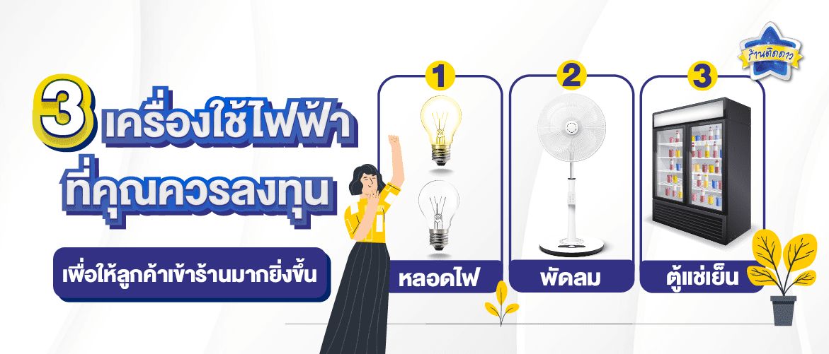 เครื่องใช้ไฟฟ้าทั้ง 3 ที่คุณควรลงทุน อย่างหลอดไฟที่ช่วยเพิ่มความสว่างให้กับร้านค้า พัดลมที่ช่วยถ่ายเทอากาศภายในร้าน ตู้ทำความเย็นเพื่อแช่เครื่องดื่ม สามารถช่วยให้ร้านค้าของคุณดูดี และยังดึงดูดให้ลูกค้าเดินเลือกซื้อสินค้าภายในร้านได้มากยิ่งขึ้น อยากได้คำแนะนำเพิ่มเติมในการเปิดร้านของชำ อย่าลืมกดติดตามเพจร้านติดดาวบนเฟซบุค คลิก